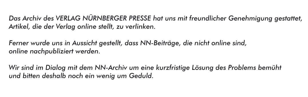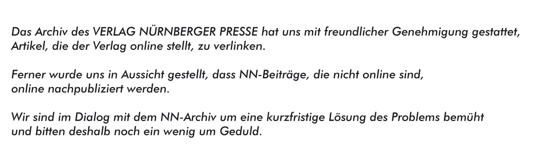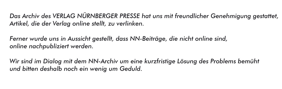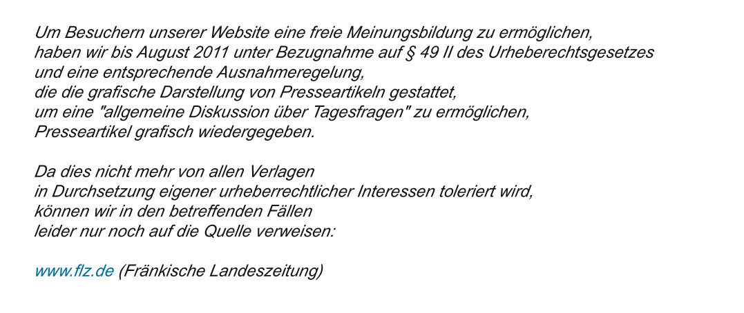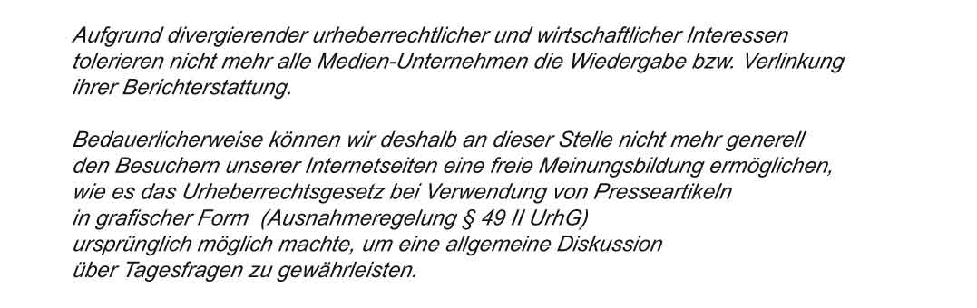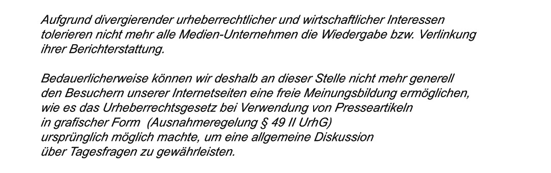 Aufgrund divergierender urheberrechtlicher Interessen tolerieren nicht mehr alle Medien-Unternehmen die Wiedergabe bzw. Verlinkung ihrer Berichterstattung. Bedauerlicherweise können wir deshalb an dieser Stelle nicht mehr generell den Besuchern unserer Internetseiten eine freie Meinungsbildung ermöglichen, wie es das Urheberrechtsgesetz bei Verwendung von Presseartikeln in grafischer Form (Ausnahmeregelung § 49 II UrhG) ursprünglich möglich machte, um eine allgemeine Diskussion über Tagesfragen zu gewährleisten. Wir bitten um Ihr Verständnis.