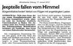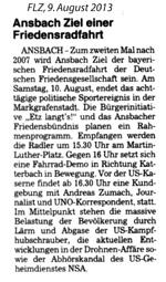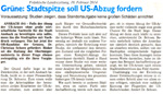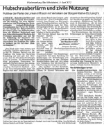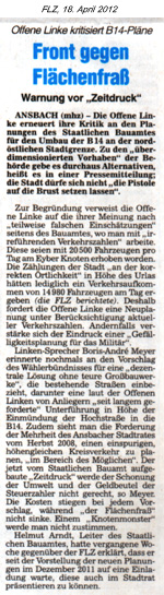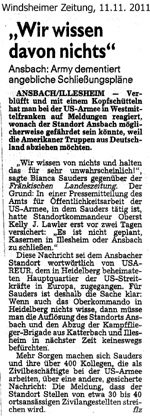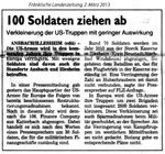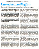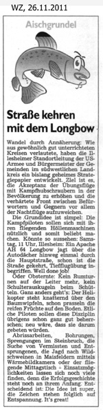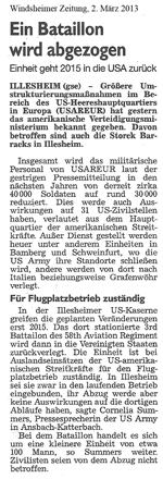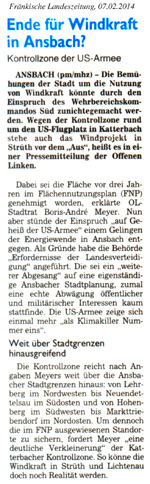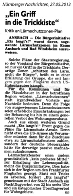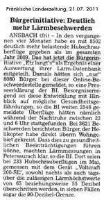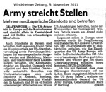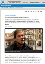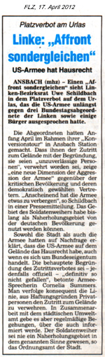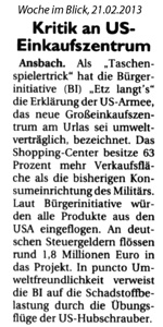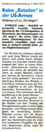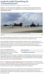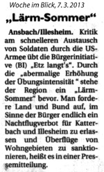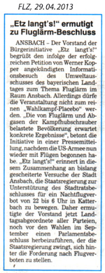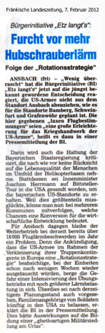 Die Bürgerinitiative "Etz langt's!" widerspricht der Ansbacher Oberbürgermeisterin Carda Seidel: Die "Strategie unverbindlicher Gespräche" sei nicht aufgegangen. Eine deutliche US-Truppenreduzierung in Ansbach müsse für die Stadt eine Option im Kampf um geringere Fluglärmbelastung sein, betonte die Bürgerinitiative. Ein Abzug der US-Truppen sei angesicht der finanziellen Lage der USA absehbar. |