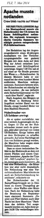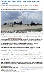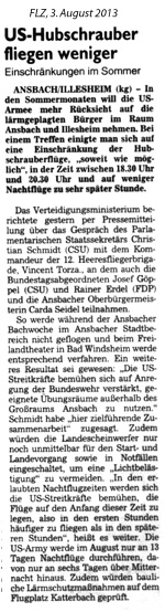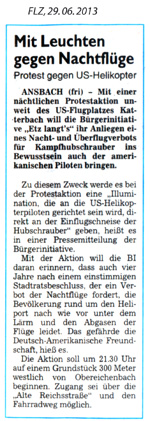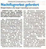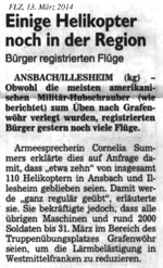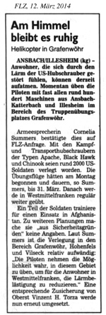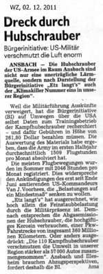 Kampfhubschrauber über Ansbach: Anwohner fordern Nachtflugverbot Rund 30 lärmgeplagte Bürger aus dem Landkreis Ansbach fordern von Landrat und Kreistag stärkeres Engagement gegen nächtliche Flugübungen amerikanischer Kampfhubschrauber. Insbesondere geht es den Anwohnern um eine stärkere Zusammenarbeit von Stadt und Landkreis Ansbach. .