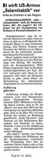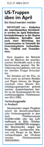 Seit 2013 Diskrepanzen in der Bewertung der Gefahrenlage von aus US-Kampfeinsätzen zurückkehrenden US-Militäreinheiten und Kriegsgerät (US-Kampfhubschrauber) in Westmittelfranken (u.a. Ansbach und Illesheim)