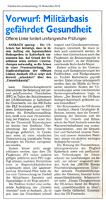 Bezug nehmend auf aktuelle öffentliche Verlautbarungen, wonach über 200 deutsche Soldaten durch Uranmunition der US-Streitkräfte verseucht sein sollen, verweist das AFB auf seit 2013 existierende Diskrepanzen bei der Bewertung der Gefahrenlage in Westmittelfranken.